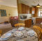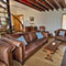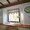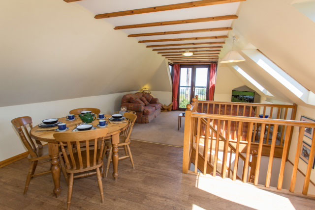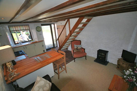 | Lower level: Living and dining area with open log fire and spiral staircase. Fully equipped kitchen; cooker, microwave, dishwasher, washer/dryer and fridge. Double bedroom. Bathroom with bath and shower.